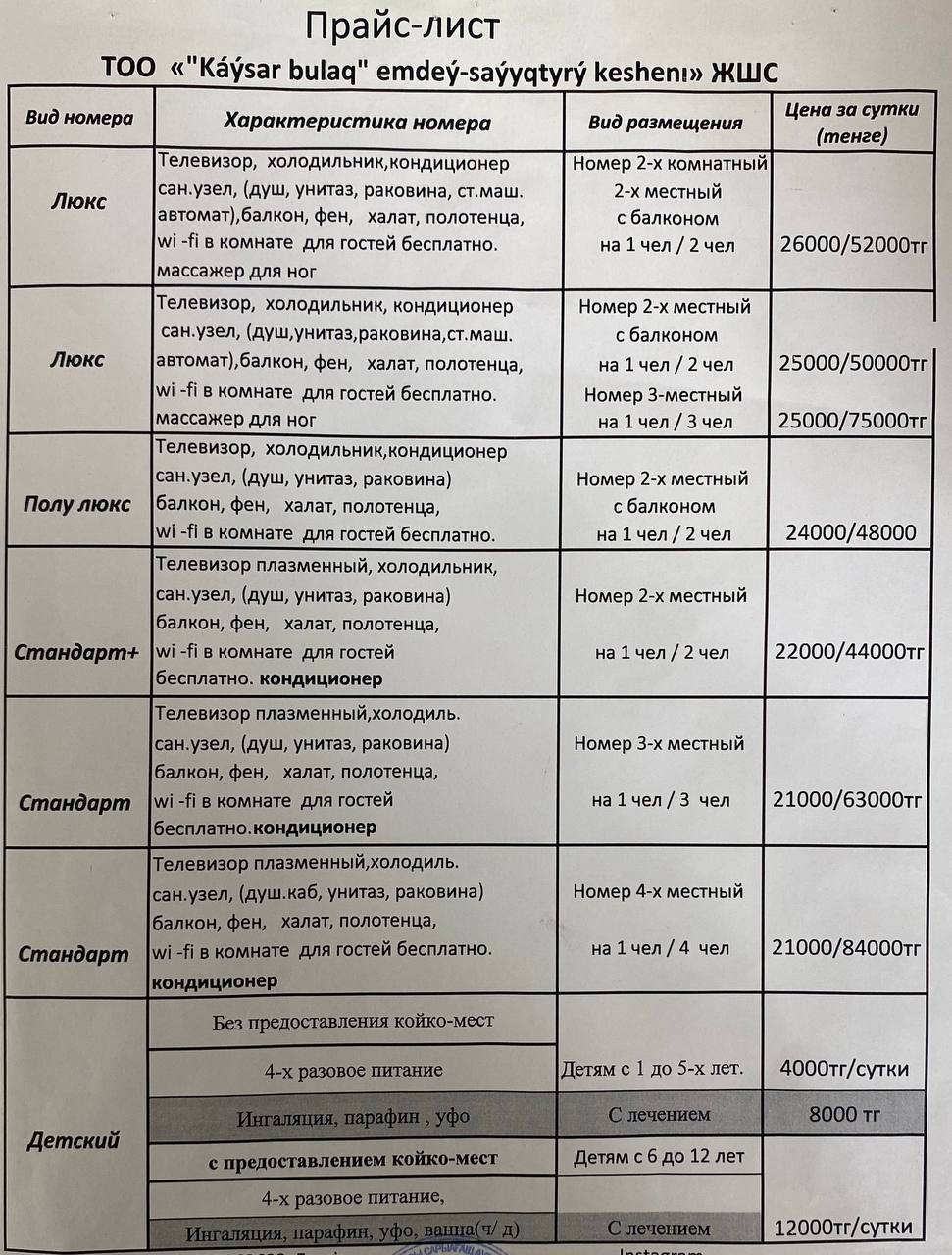 В санаторий Каусар - Булак работают квалифицированные врачи с высшей категорией.Их осмотр проводиться каждый день бесплатно.